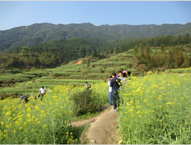 第二天上午我們乘車來(lái)到江西婺源江嶺,婺源歸來(lái)不看村,江嶺歸來(lái)不看花。江嶺,是國(guó)內(nèi)四大油菜花海之一,江嶺自然是婺源觀賞油菜花的首選之地。萬(wàn)畝油菜花海在漫山遍野的梯田間肆意綻放。漫步于高低蜿蜒的觀景棧道,如同來(lái)到一片花的海洋。黃燦燦的花陣隨風(fēng)搖擺,就像一層層翻涌的波浪。在綿延起伏金黃花海之中,形成清新淳美的鄉(xiāng)村田園風(fēng)光,一派生趣盎然。