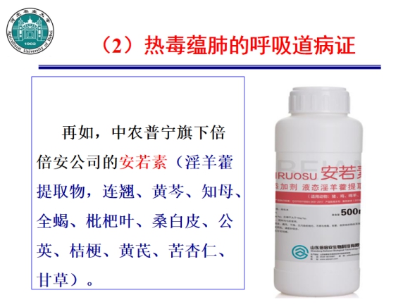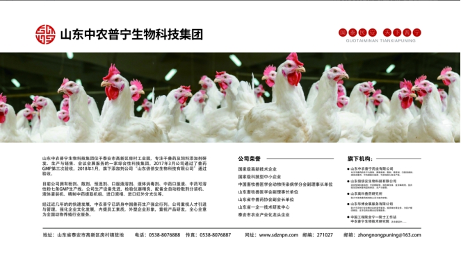 隨著政府對動物源性食品安全問題的極大關注以及民眾對食品安全重要性認識的不斷提高,中獸醫(yī)藥必將在畜禽綠色健康養(yǎng)殖中發(fā)揮出更大的作用,為此,作為以致力于動物健康與食品安全為發(fā)展宗旨的中農普寧生物科技集團,通過中獸醫(yī)專家的潛心研發(fā)經過多年臨床實踐,結合國內肉雞養(yǎng)殖特點,隆重推出了安爾康、安若素、倍爾爽等中藥產品,為養(yǎng)殖業(yè)保駕護航。