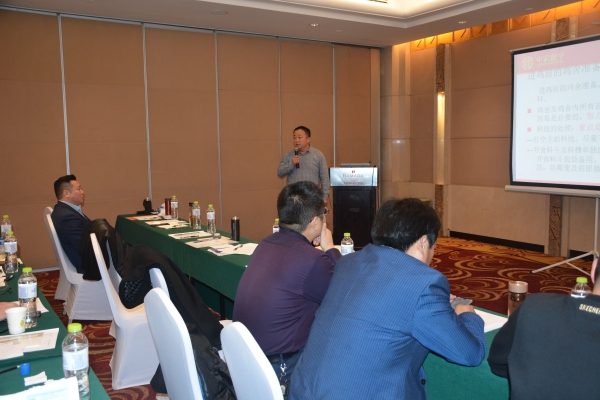 隨后,技術(shù)服務(wù)部曹全營經(jīng)理、技術(shù)專員周恒經(jīng)理、王淼老師針對全年市場流行病及經(jīng)典產(chǎn)品使用方案作了精彩實用的報告,兩位經(jīng)理通過各地的走訪巡診,積累了豐富的飼養(yǎng)管理經(jīng)驗、疾病預(yù)防和診斷經(jīng)驗、產(chǎn)品使用經(jīng)驗,他的課件圖文并茂,非常實用,對接下的工作開展具有重要意義。 技術(shù)服務(wù)部曹全營經(jīng)理作匯報 技術(shù)服務(wù)專員周恒作匯報 資深水禽專家王淼老師授課